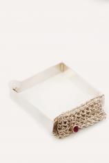 Bratara este realizata integral din argint 925. Partea fixa a piesei este impodobita cu o structura mobila confectionata din zale impletite manual. Centrul de atractie al bijuteriei il reprezinta rubinul de sinteza, care o defineste si o completeaza.